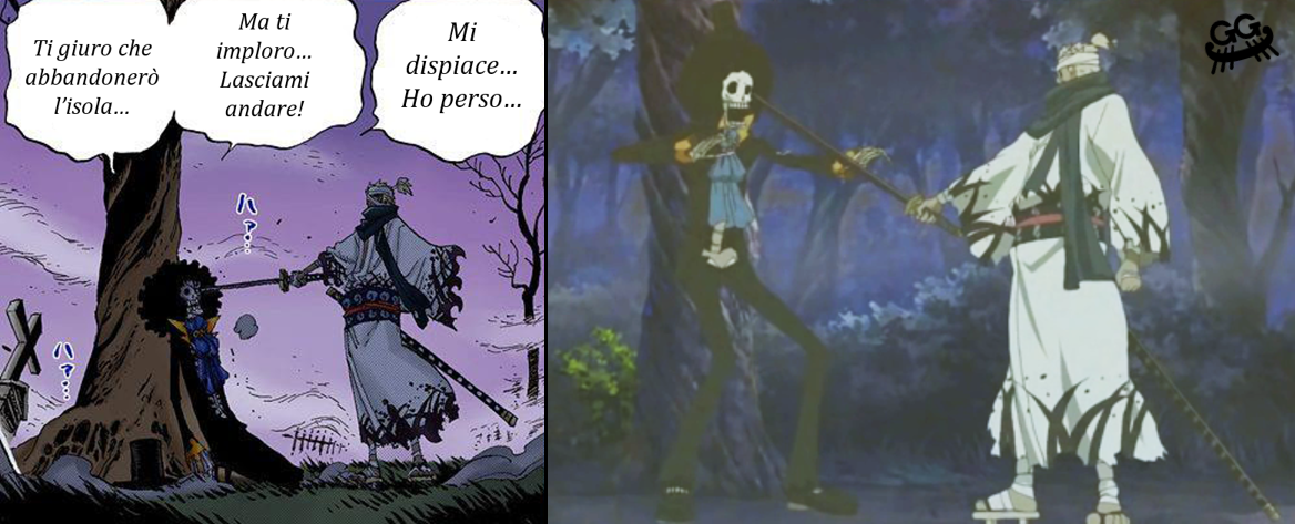 Per la prima, ci tocca rimembrare il flashback del primo duello fra Brook e Ryuma -avvenuto 5 anni prima dell’inizio della saga- e in particolare la conclusione del suddetto scontro: nel